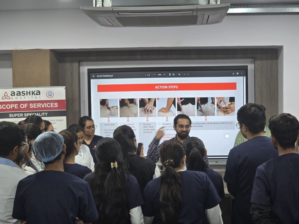 The program was conducted in collaboration with Aashka Hospital. During the session, participants received detailed guidance on how to administer CPR during cardiac arrest, the correct technique for heart compressions, rhythm, chest recoil, emergency response, and primary life saving protocols. Trainers provided live demonstrations followed by hands-on practice, enabling attendees to learn and perform this vital life-saving procedure effectively.